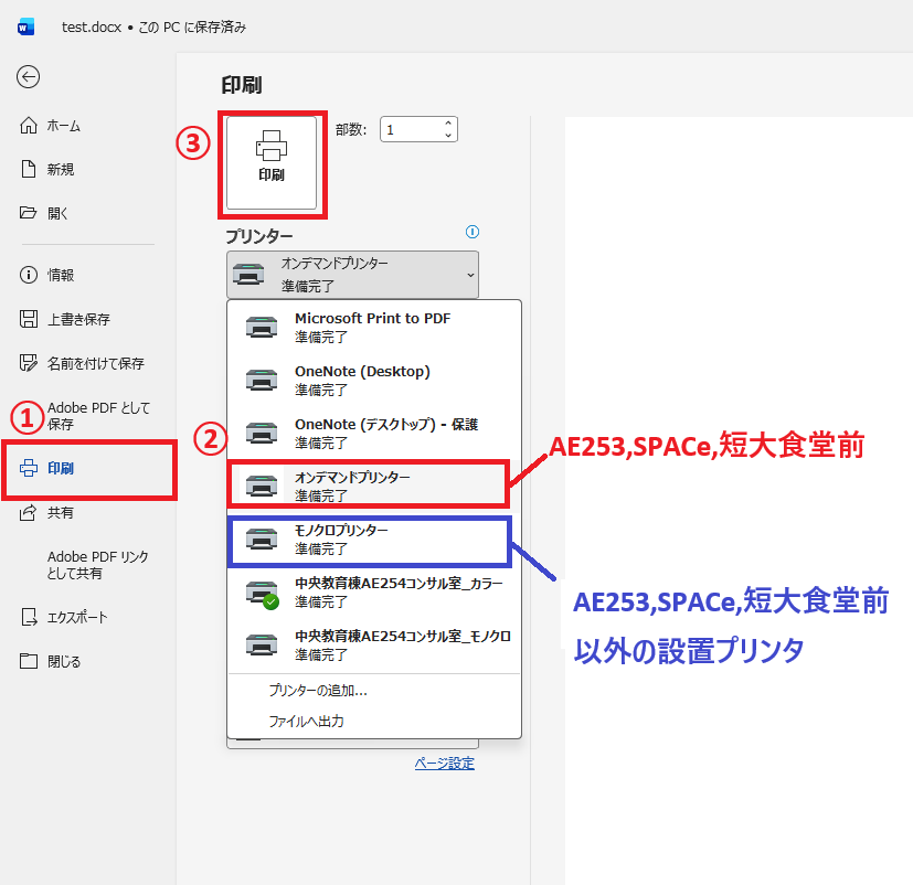 ②プリンターを選択して、印刷を行う