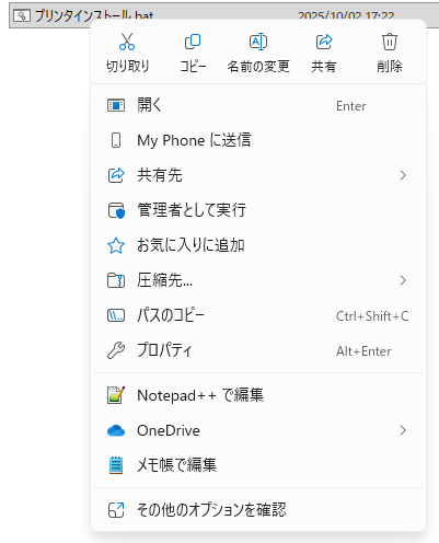 ③「プリンタインストール」を右クリックし、「管理者として実行」を選択。